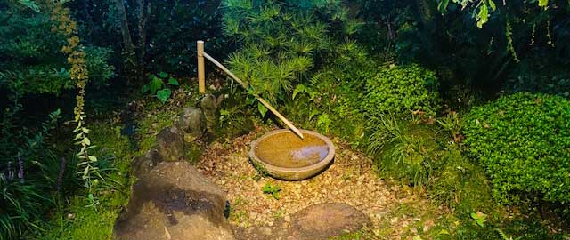 夜半に着いて、屋外ライトで照らした手水鉢。
