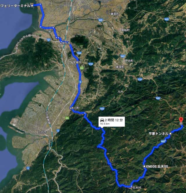 - 熊本港→ 氷川町→ 五木村→ ENEOS五木SS→ 佐倉荘