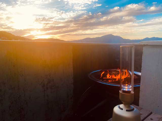 暮れていく長崎の空。ファイヤーピットで燃えているのは機械屋(中島洋一郎)さんから頂いた薪。