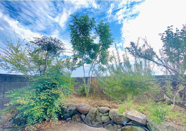 一昨年植えつけた中央のシマトネリコ。樹高40㎝ぐらいだったものが、今では2.5mくらい。同時期に植えつけた左端のシルバープリペットも樹高が1.6mくらいになりました。なお写真右端は木化したローズマリー。