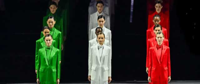 イタリアの国旗の色である緑、白、赤、それぞれを基調としたジョルジオ アルマーニのパンツスーツを身にまとったモデルが色ごとに列をなしパレード。うつくしい。