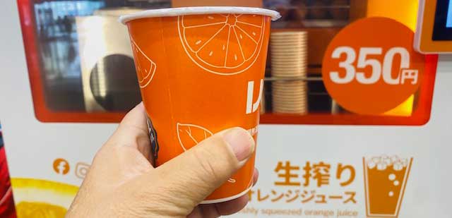 オレンジ4個を約45秒で自動搾りする、1杯350円(約280ml)の生搾りオレンジジュース自販機。砂糖・水・無添加で、果汁100%といいます。
