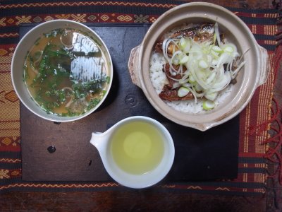なにやかにやで世間と身辺がざわつき疲れモード。里山。まつを再生装置の休暇小屋で読書・食事・睡眠・読書・食事・睡眠……。写真はその中の一食。炊き立てご飯にさんま缶、みそ汁、お茶。粗食。ありがたくいただく。『CASA』、『藝術新潮』、『文藝春秋』とそのあたりにある本を読む。今回芥川賞受賞の『苦役列車』を引きずられるように読む。終日、雨。