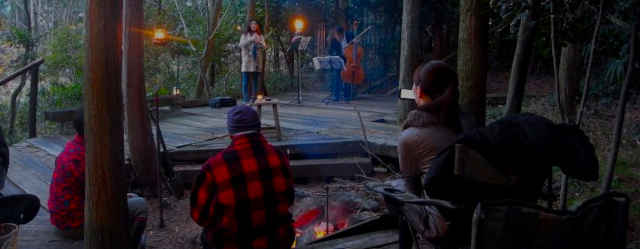 ランタン灯る森の中、クラリネットとチェロから奏でられる音楽に、焚き火のはぜる音が彩糸のように織り込まれ、