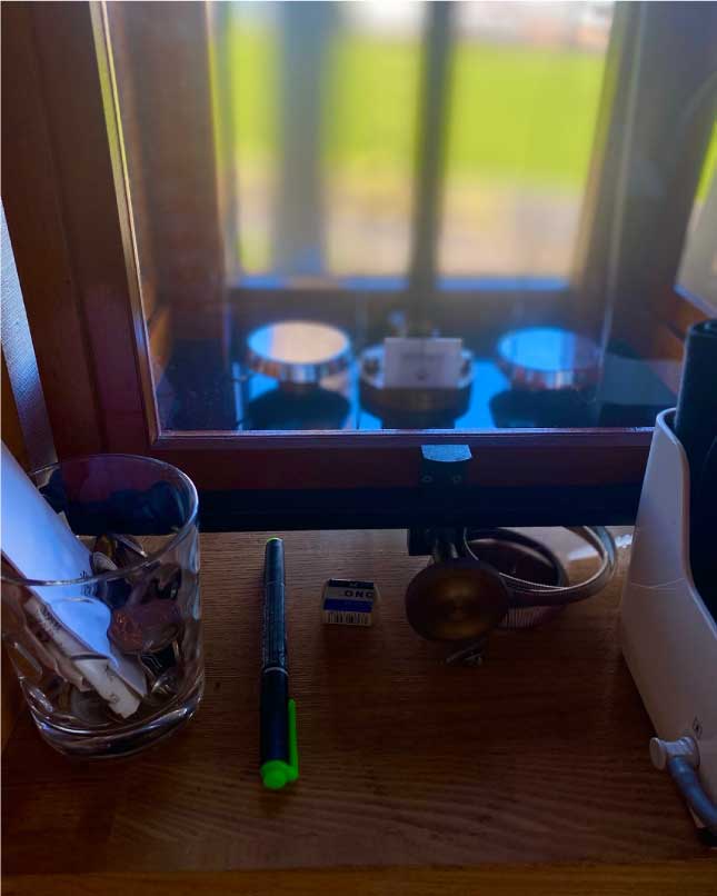 氷を浮かべた湧水がおいしい。Boseモニターからお気に入りの音楽を流しながら、雑誌をながめるひととき。
