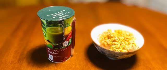 今日の朝食は、スムージー、ごはんに納豆と削り節、そしてコーヒー。
