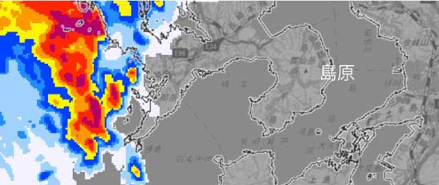 確認していただくとわかるのですが、上記雨雲レーダーの地図でも島原湾と記載されています。ヘンなの。
