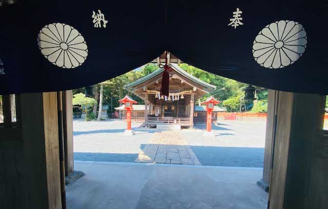 毎年春・秋の沖津宮大祭と沖津宮現地大祭の2日、上写真では閉じている扉が開き、沖ノ島を見ることができます。