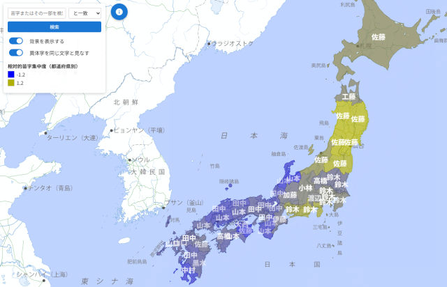 ラベルはその地域で一番多い苗字を示しており、