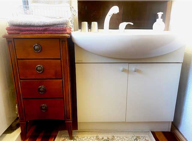 購入するまでに数年かかりました。写真をご覧になると分かるように、洗面台と洗濯機の間の幅、奥行、高さ、それにテイストがシンデレラ・フィットする製品に出会うまでに手こずったんです。